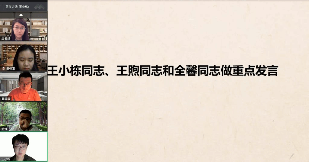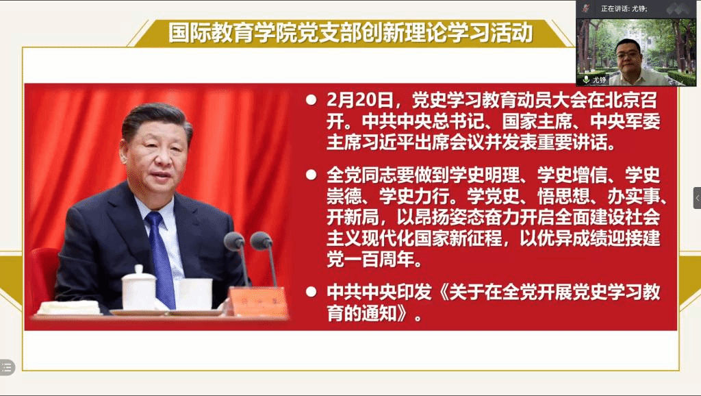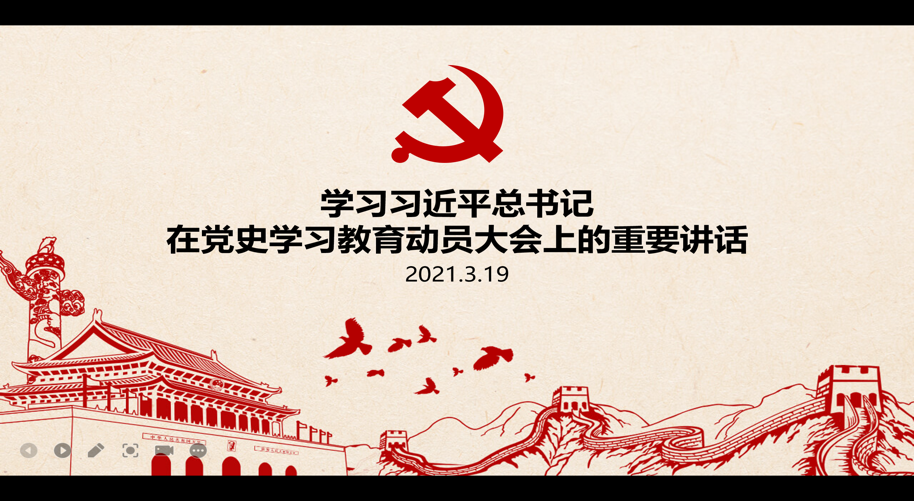 首先,青年教师尤铮同志领学习近平总书记在党史学习教育动员大会上的讲话内容。第一,学史明理。要深刻学习领会新时代党的创新理论,坚持不懈用党的创新理论最新成果武装头脑、指导实践、推动工作。第二,学史增信。我们党历来重视党史学习教育,注重用党的奋斗历程和伟大成就鼓舞斗志、明确方向。第三,学史崇德。学习党史,就是要用党的光荣传统和优良作风坚定信念、凝聚力量,用党的实践创造和历史经验启迪智慧、砥砺品格。第四,学史力行。党的百年辉煌历程就是党全心全意为人民服务的历程,党始终把人民放在心中最高位置、把人民对美好生活的向往作为奋斗目标,推动改革发展成果更多更公平惠及全体人民,推动共同富裕取得更为明显的实质性进展,把14亿中国人民凝聚成推动中华民族伟大复兴的磅礴力量。同时,尤铮同志带领与会党员观看主题视频,视频呈现了不同年代、不同岗位的中国共产党员奋斗在革命、建设和改革的第一线,为中华民族伟大复兴中华梦的实现默默努力的感人事迹。